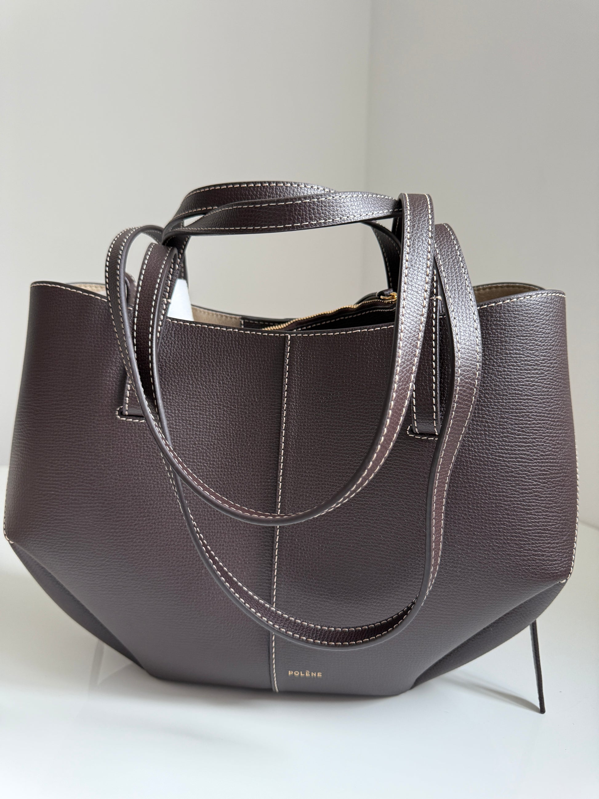 This Polène Cyme Mini tote is a sculptural mini bag crafted from textured calf leather. Its compact design features graceful waves and folds; you can carry it open to show its basket-style silhouette or tuck in the sides for a more closed look. Handcrafted by artisans in Ubrique, Spain, the bag includes two leather handles (40 cm and 60 cm lengths) and a removable zippered pocket (20.5 × 12 cm). It has a magnetic closure and comes brand new with receipts.